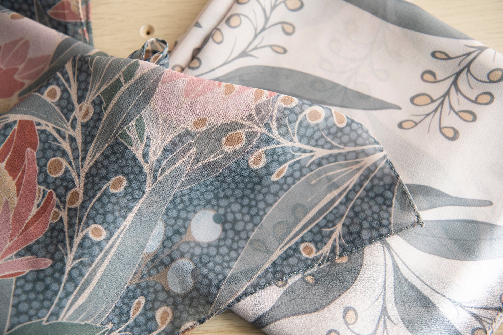 Soft and flowing georgette made from 100% recycled materials. Signature Magnolia Road Protea floral design featuring a palette of salmon, rose, sage, soft blues and neutrals. Scarf is 27"x27".