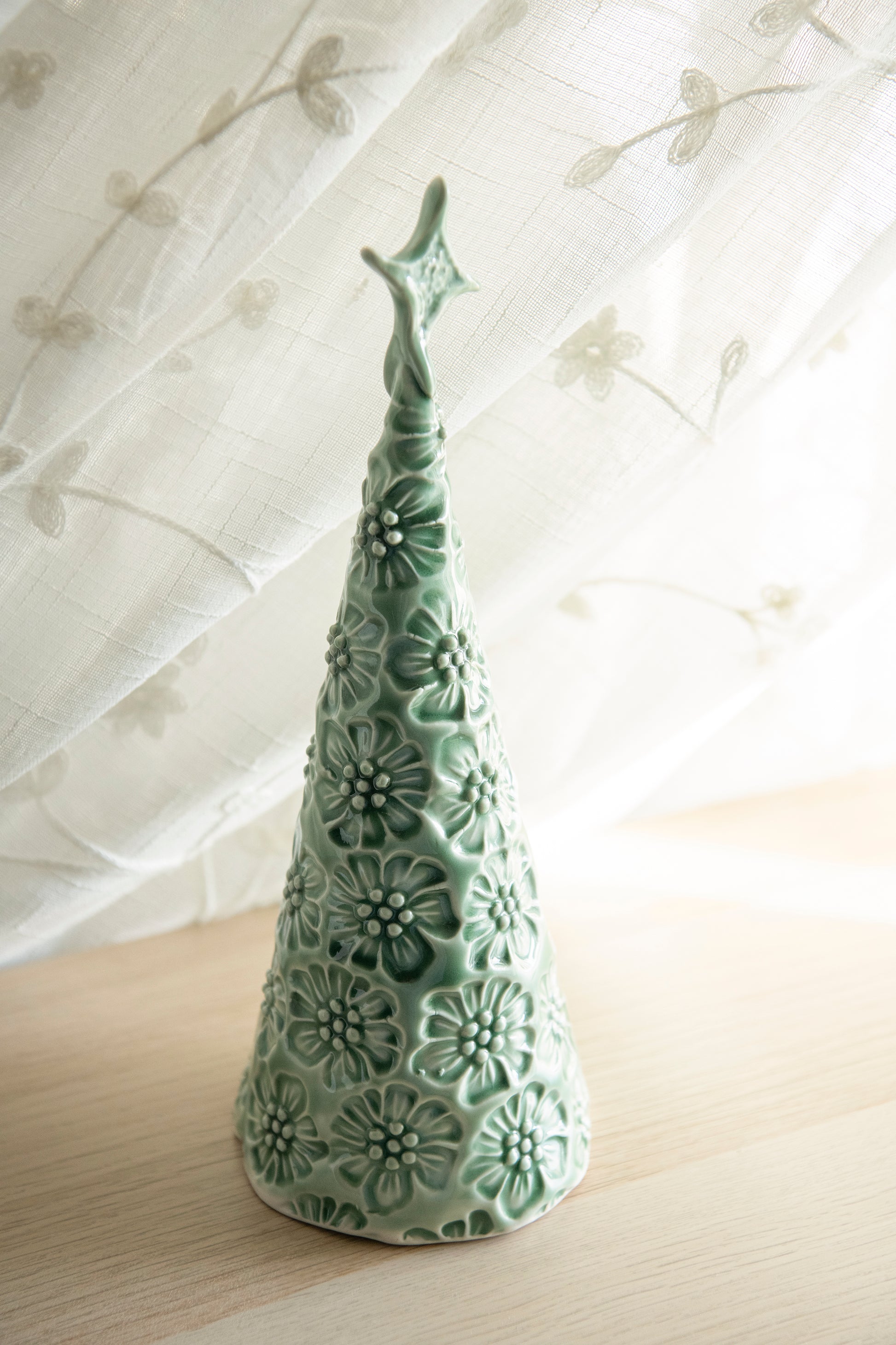 Botanicals with a holiday twist. Hand-stamped porcelain tree finished with a bright jade celadon. Approximately 10" tall. Much like in nature, each porcelain tree is unique and patterns will vary.
